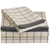 Blending a modern color scheme with traditional design flourishes, this 4-piece complete set of sheets for California King beds from the Tommy Hilfiger Hudson Valley bedding collection offers a stately complement to the contemporary master bedroom. It includes 1 flat sheet, 1 fitted sheet, and 2 King-sized pillowcases. Offering a counterpoint to the gray hues of the collection's duvet cover and comforter, the sheets feature a textured herringbone in cream that's overlaid with a printed blue and grey windowpane pattern. They're made from ultra-smooth 300-thread-count 100 percent cotton that features a sateen fabric weave, where most threads are placed on the surface to give them a glossy, lustrous shine and a hand feel as luxurious as silk. The flat sheet measures 108 by 102 inches and the fitted sheet--which fits mattresses up to 18 inches deep--measures 72 by 84 inches. Machine washable for easy care.
