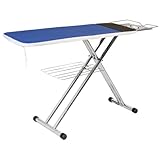 Combining professional-grade durability with versatile convenience, this innovative ironing table provides an array of features to make ironing both simple and efficient. The table's height adjusts from 30 to 38 inches for a comfortable working position, while its generous 47-1/4-by-18-8/9-inch work surface accommodates more fabric at a time for faster results. An extra-large extension piece also comes included, sliding easily over the original board to create a spacious 55-by-18-8/9-inch working surface for oversized pieces like tablecloths, draperies, and other large items. Furthermore, the unit's mesh-screened working surface, treated with an anti-rust coating, ensures maximum passage of steam without damage or corrosion. The ironing table also provides a reinforced end trap that can hold either a traditional iron or an iron-steam generator, as well as a lower shelf rack that comes in handy for hangers, folded clothing, clothespins, or distilled water for steaming. The unit assembles in minutes, and its X-shaped legs give way to broad feet capped with slide-free tips for stability. Two cover pads come included: a 47-by-19-inch high-performance one-piece cotton cover set and a 19-by-55-inch pad and cover set with heat- and fire-resistant material at the end for safely setting down a hot iron. The ironing table measures 55 by 19 by 38 inches.