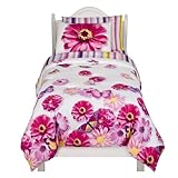 Contemporary styling meets chic coloration in this Botanica complete bedroom ensemble! The face of the comforter features The face of the comforter features large, vibrant 3-D blooming gerbera daisies and peonies and fluttering butterflies in shades of magenta, pink, yellow, lavender and purple on a crisp white ground; comforter reverses to the same daisy and peony floral and butterfly pattern. The standard pillow shams feature large magenta pink gerbera daisies on a pure white ground; shams reverse to the same daisy print. The coordinating, 200 thread count sheets and pillowcases feature vertical ombre stripes in hues of lavender, purple, pink, magenta, and yellow, on a white ground. The comforter, shams and sheet set are constructed of easy-care 100% pure cotton; all components are machine washable. The Botanica complete bedroom ensemble retails for 129.99 in better specialty chains and upscale department stores!